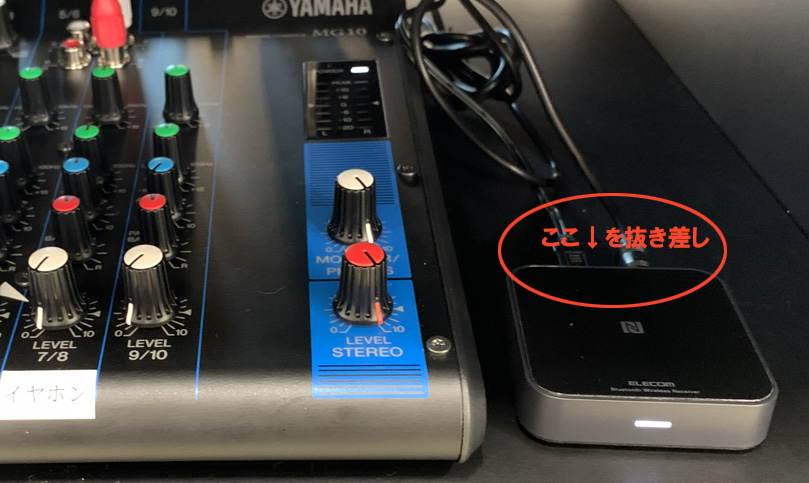 音楽を再生しながらマイクを使用したい場合には、ミキサーの(7/8イヤホン)にぶら下がっているオーディオレシーバーのほうにスマートフォンをペアリングさせてください。端末名は「AVWAR501」です。
