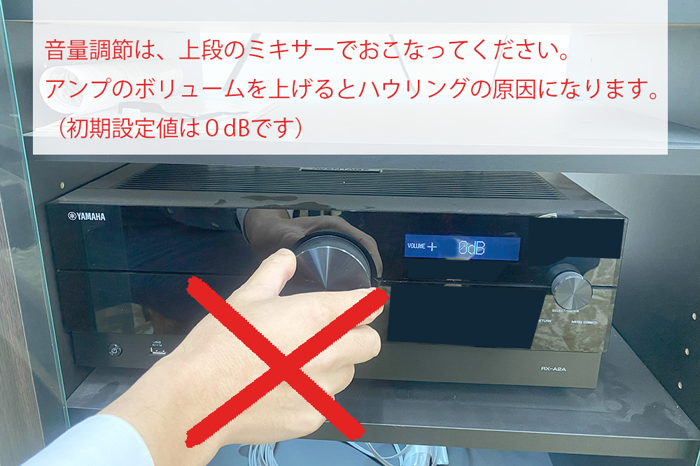 音量をアンプ側で上げていませんか? マイクの音量はミキサーで調整してください。